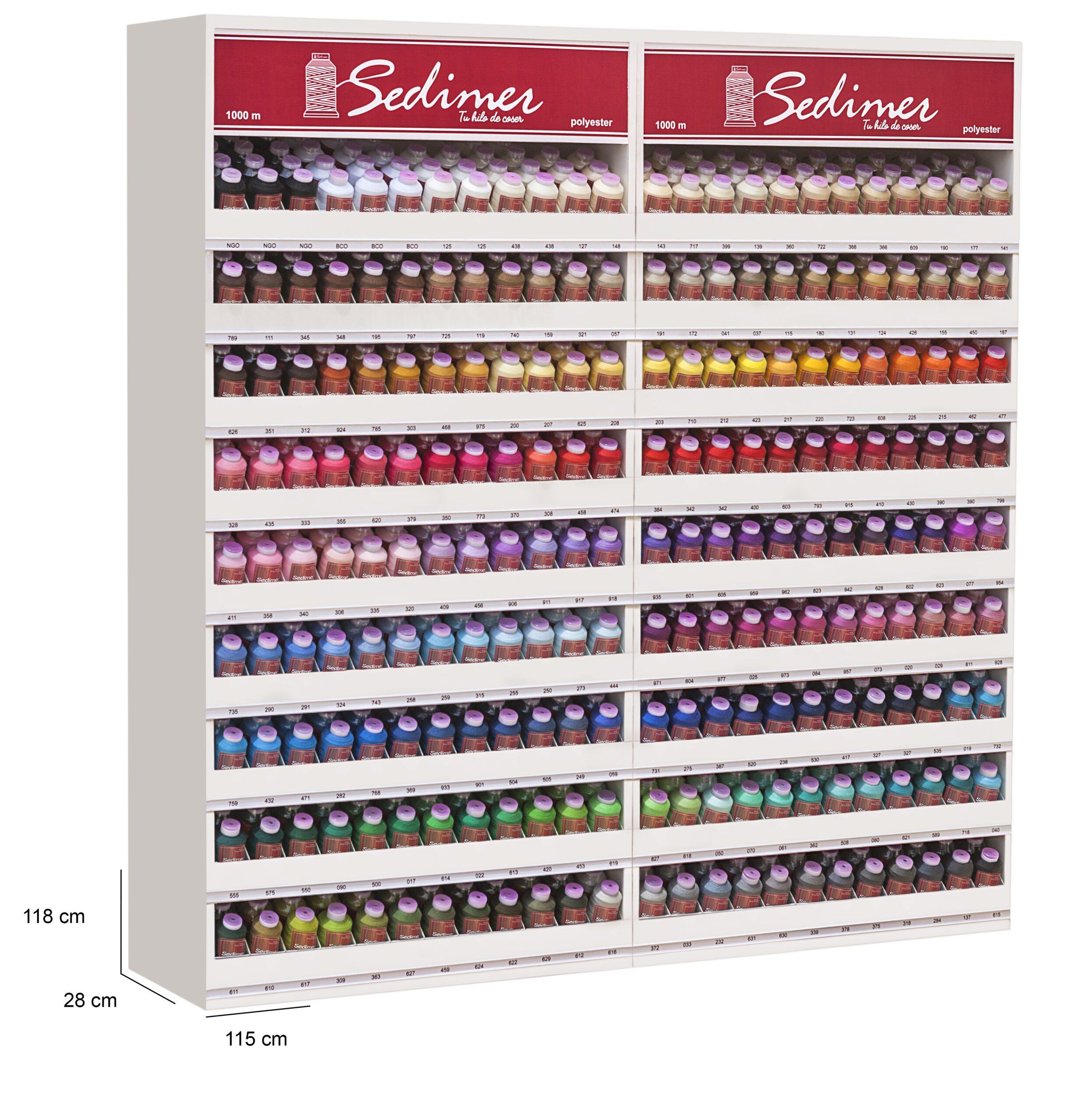 Conjunto de dos expositores de carretubos de 1000 metros EXPO10M, para mostrador o sobremesa. Contienen el colorido completo de 206 colores. Este expositor tiene 216 huecos y una carga de 1080 conos (cinco conos por color).
